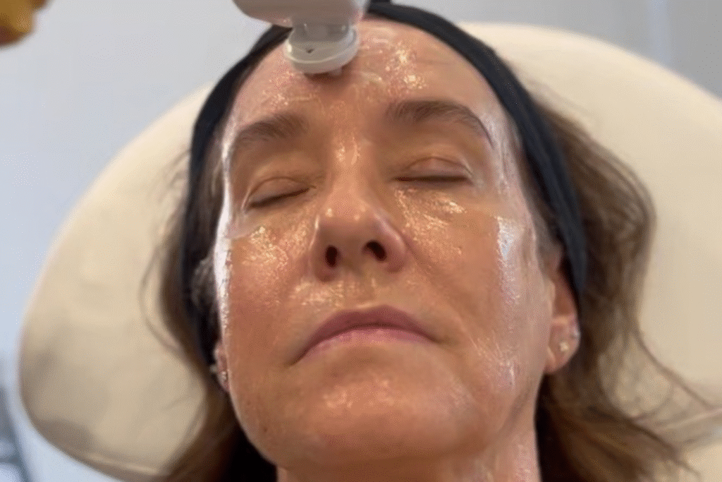 Circular sculpting motions, lower-face contouring, forehead lifting, and a 20-minute ultrasound infusion leave the skin lifted, firm, and luminous.